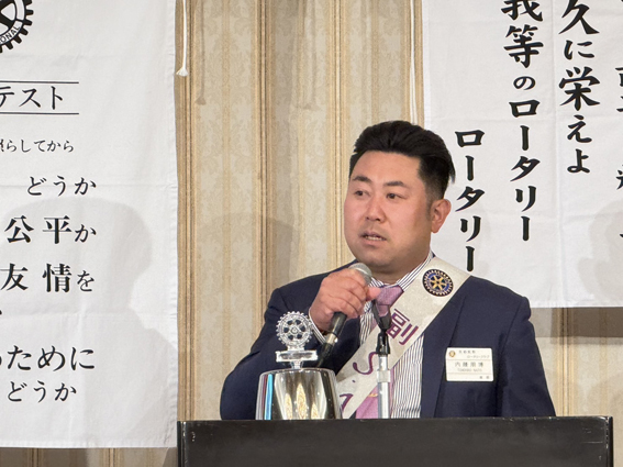 山口 博也社会奉仕理事、小林 田巳生国際奉仕理事、下市 幸則青少年奉仕理事、大西 豊SAAによる「就任挨拶」でした。