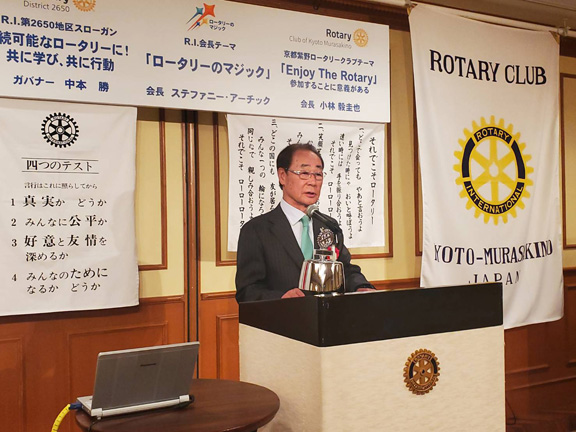 例会スピーチは 佛教大学歴史学部教授 京都中RC会員 八木透氏様による「京都特有の家族関係の背景を考える」でした。