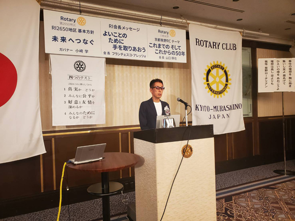 本日の例会スピーチは株式会社 京都紋付 代表取締役社長 荒川 徹様による