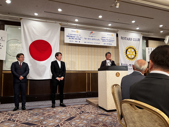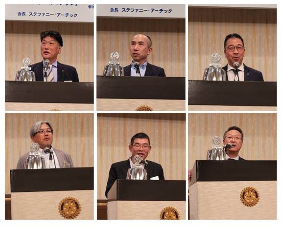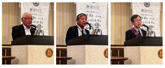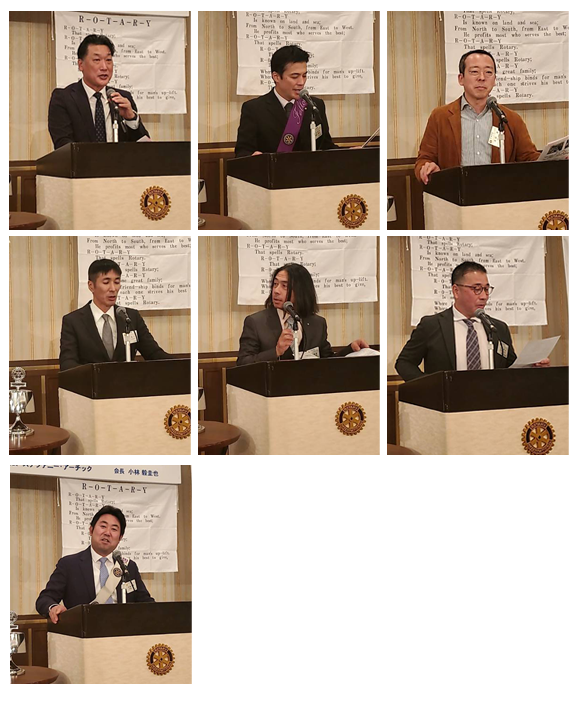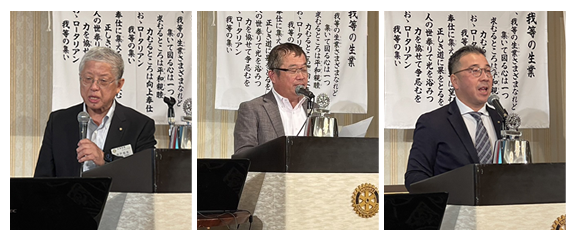 山口 博也社会奉仕理事、小林 田巳生国際奉仕理事、下市 幸則青少年奉仕理事、大西 豊SAAによる「就任挨拶」でした。
